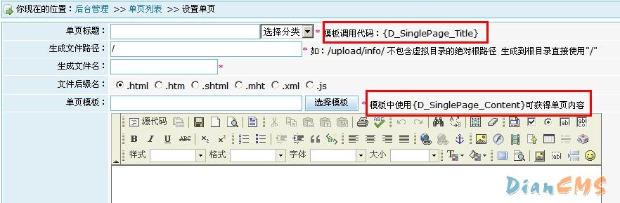请注册查看创建单页时的说明。单页标题以及单页内容需要在单页指定的模板中放入相应标签,如单页标题:需要在单页模板中插入:{D_SinglePage_Title}