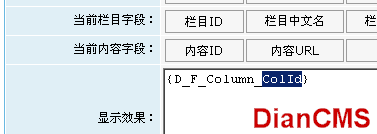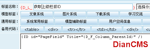 上图中选中的【ColId】(黑色区域),就是我们数据表【D_Column】中的字段名称。把选中的【ColId】换成其表中的任何字段名称都可以调用相关信息。(由于版面显示原因,这里只能够部分显示,更多的还需要如上手动写上)。如果主的问题,需要调用当前栏目的父栏目id,在数据表【D_Column】中,保存父栏目id的字段名是:【ParentId】,这里改成的结果就是:{D_F_Column_ParentId}即可。